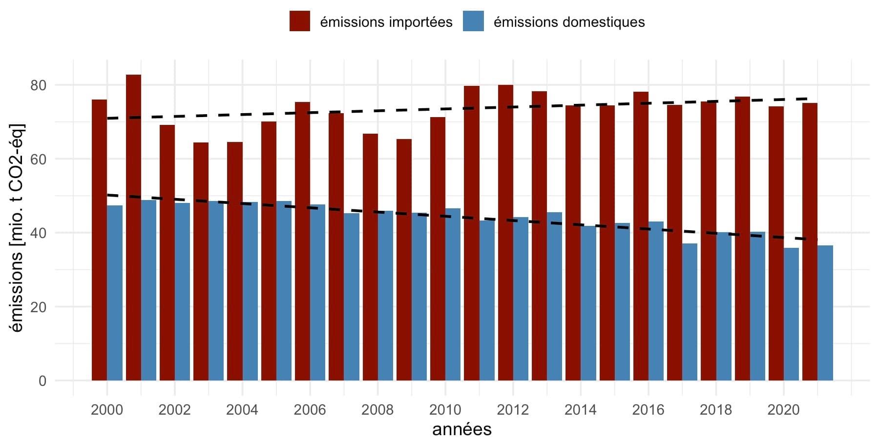 Selon les données de l’Office fédéral de la statistique, au moins deux tiers de notre empreinte climatique totale proviennent de l’étranger (2). Alors que les émissions domestiques ont pu être réduites d’environ 23 %, les émissions importées n’ont guère baissé depuis 2000, et ont même fortement augmenté selon certaines estimations. L’Office fédéral de la statistique parle d’une baisse d’à peine 1 %, tandis que le Global Carbon Project évoque une hausse de plus de 30 % (7).